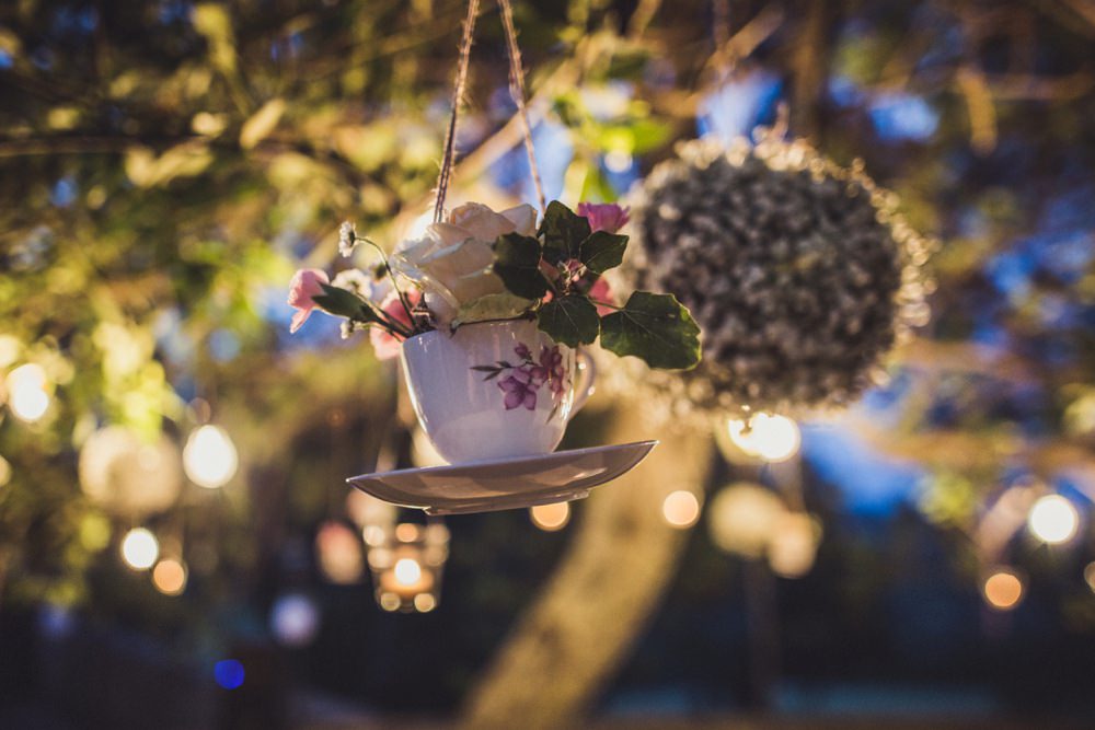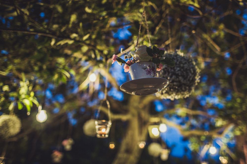 We re-used the flower pots and larger flowers around the chill out and dinner areas and in addition in the chill out area we had a extra-large heart made from flowers hung from the balcony, tea cups with flowers and candles in hanging from trees and balls of flowers hanging from lights
